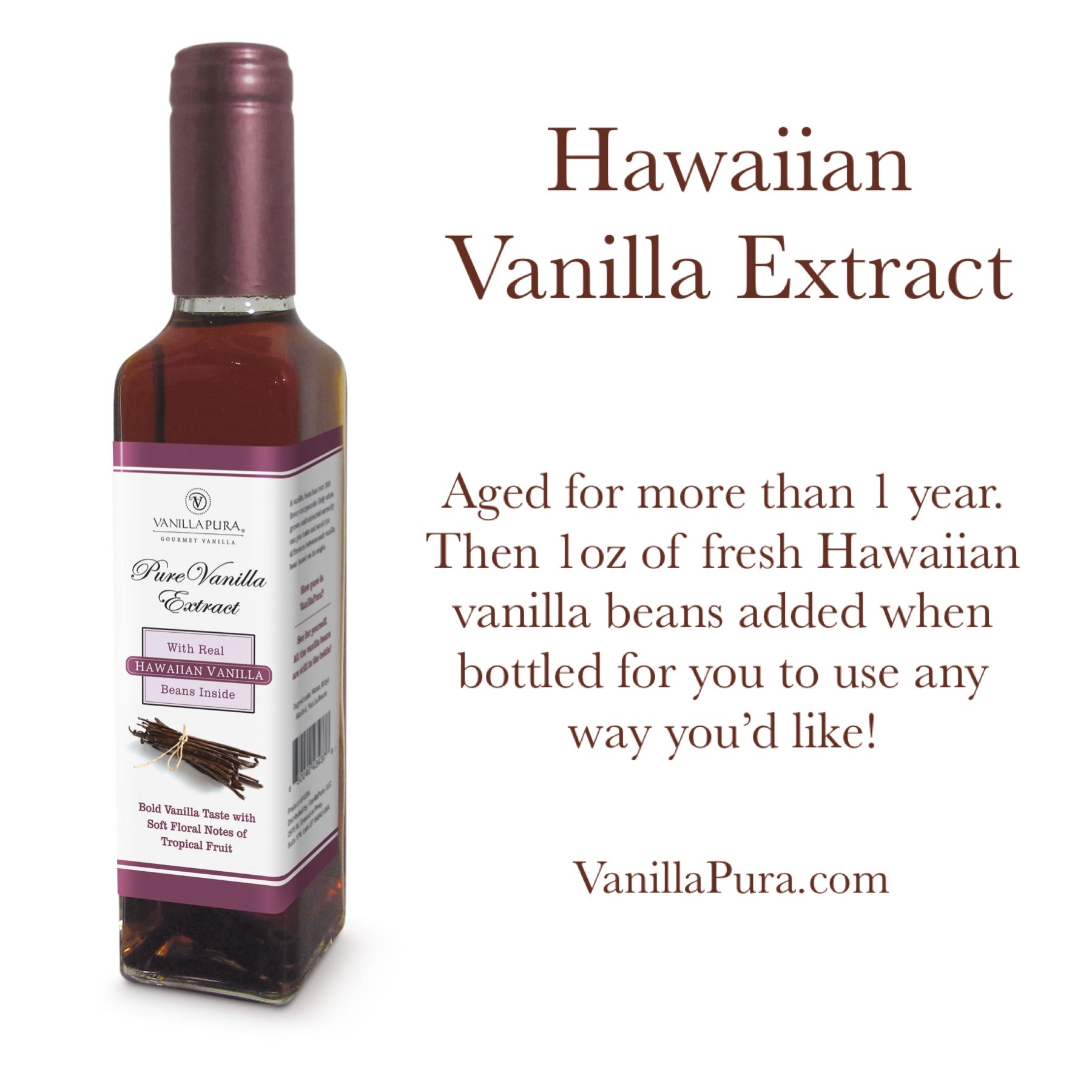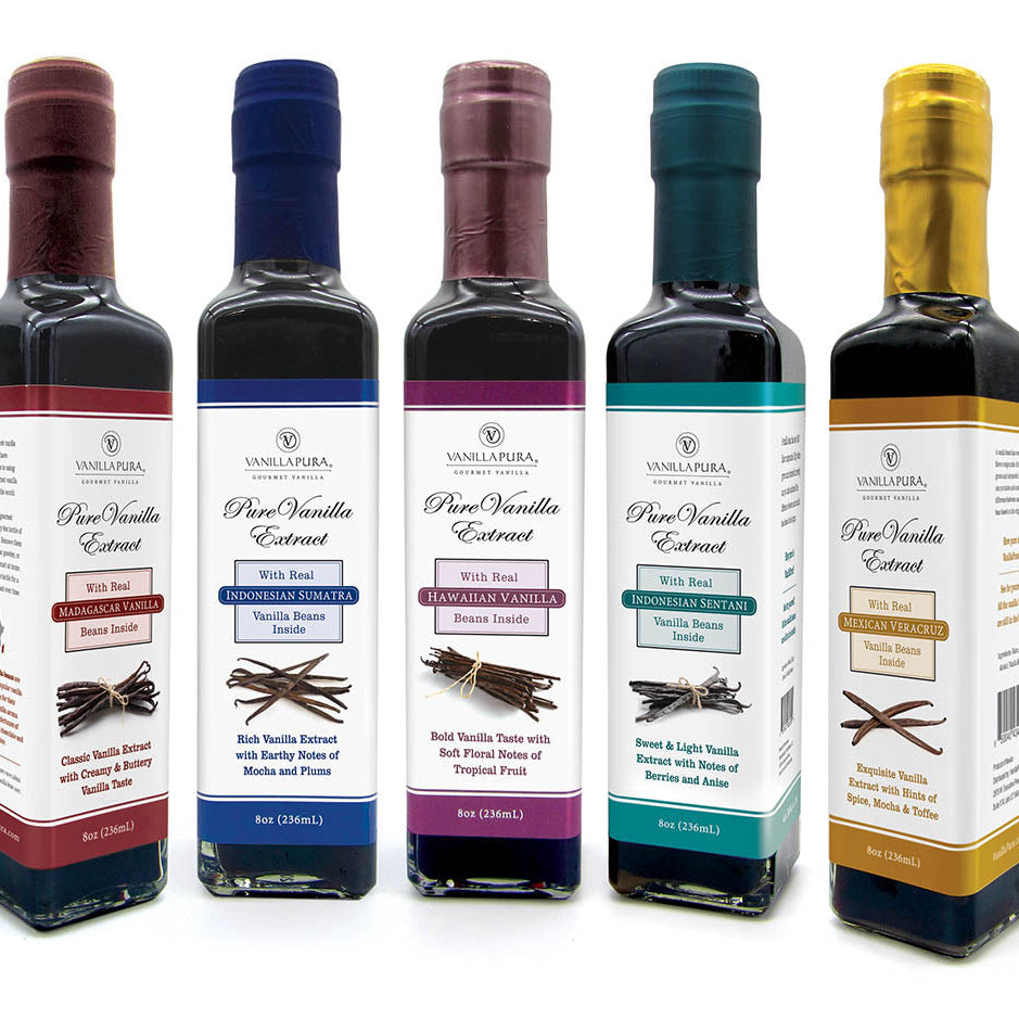 VanillaPura extracts are the only extracts in the world with all the vanilla beans still in the bottle. That's right, 1 full ounce of new vanilla beans is in every 8oz bottle of extract. Using our proprietary extract methods, we age our vanilla extract and then we add 1oz of fresh, new vanilla beans at the time of bottling for even more vanilla sweetness. The result is a rich extract experience that enhances the taste and aroma of more than 300 flavor compounds in every vanilla bean.