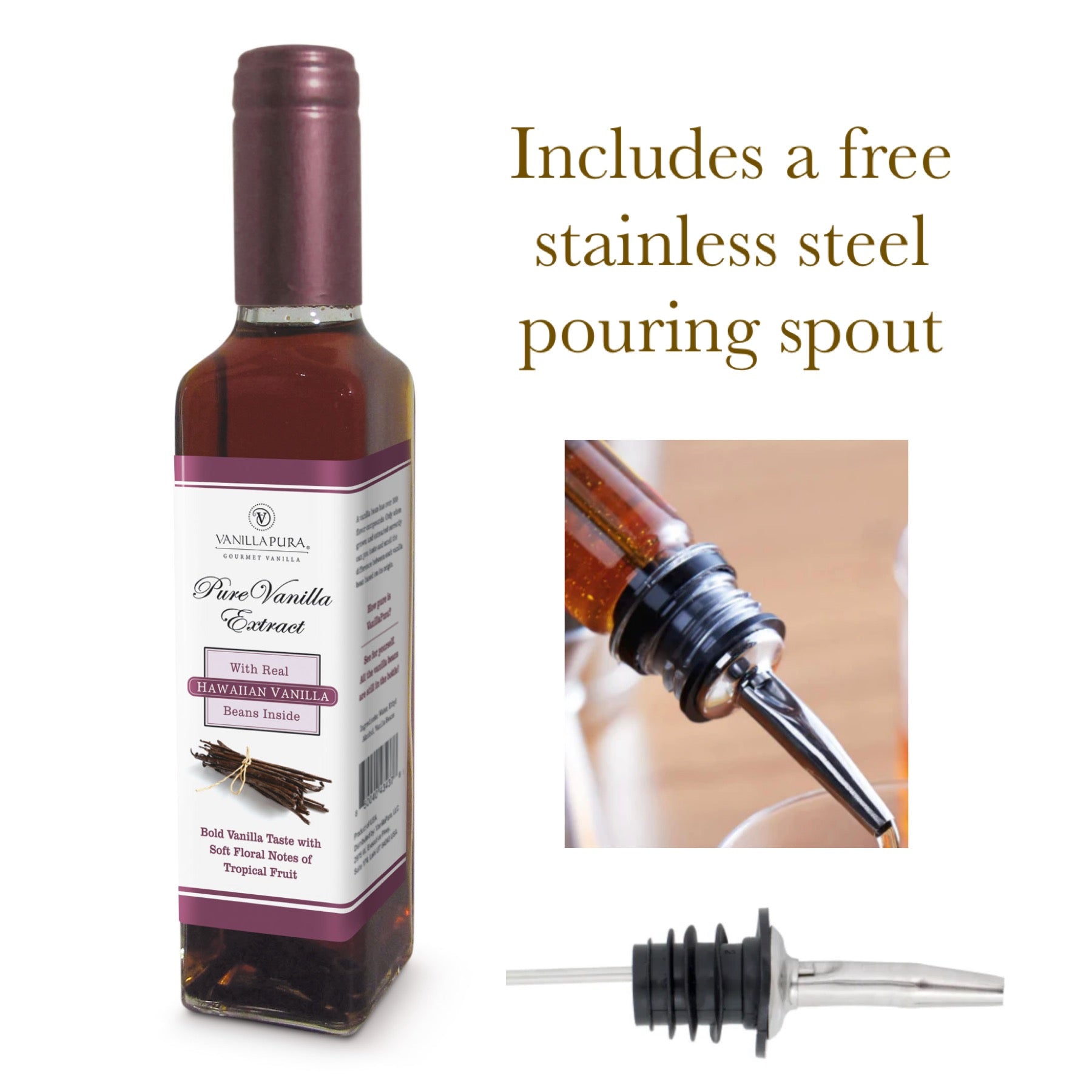 Every 8oz bottle of VanillaPura extracts comes with this stainless steel, no-mess pouring spout at no additional charge.