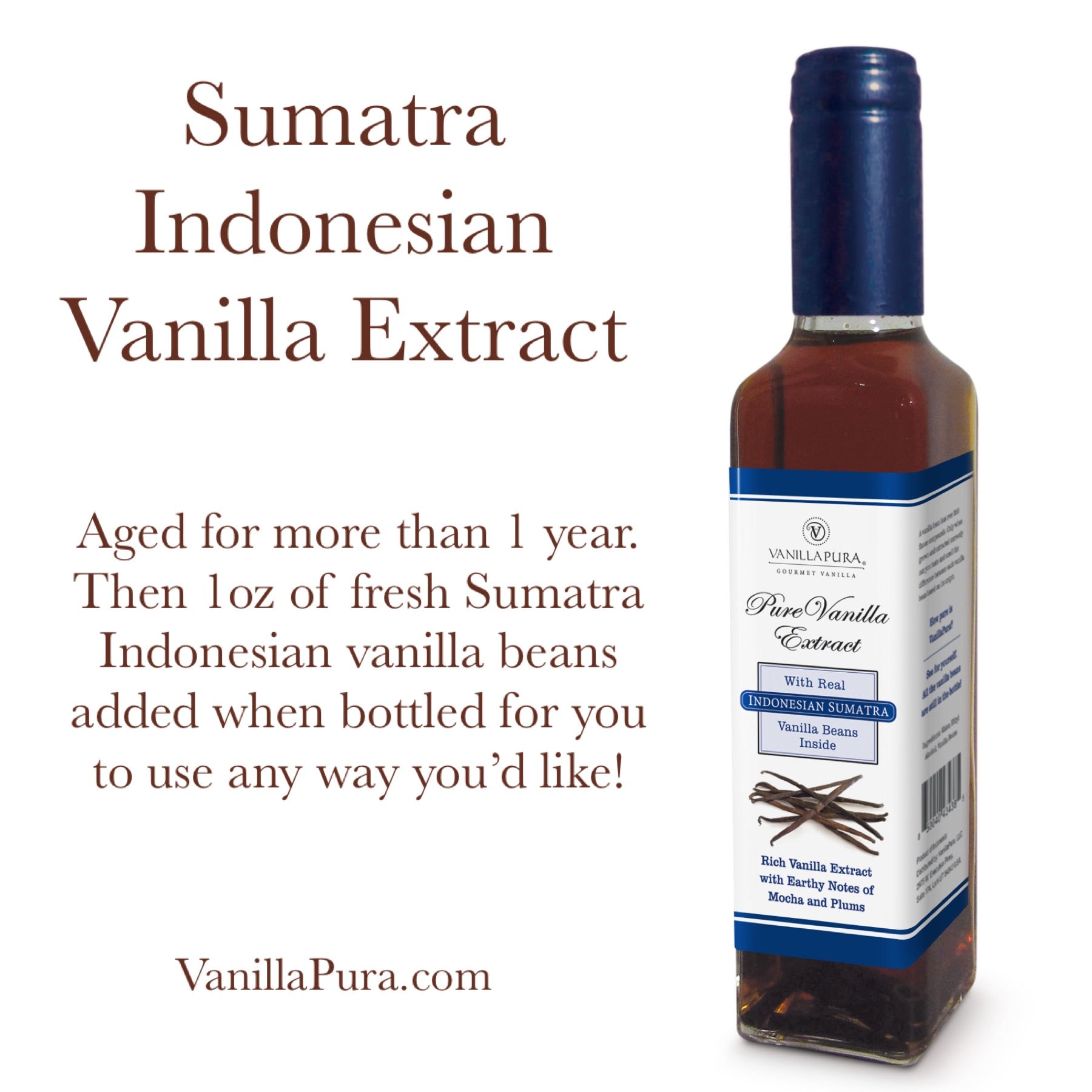 Sumatra Indonesian vanilla beans that are included in the bottle are very oily with a strong vanilla scent. They typically have a higher vanillin content than all other Indonesian beans, making them ideal for vanilla sugars, homemade ice creams and other frosting and cream applications.