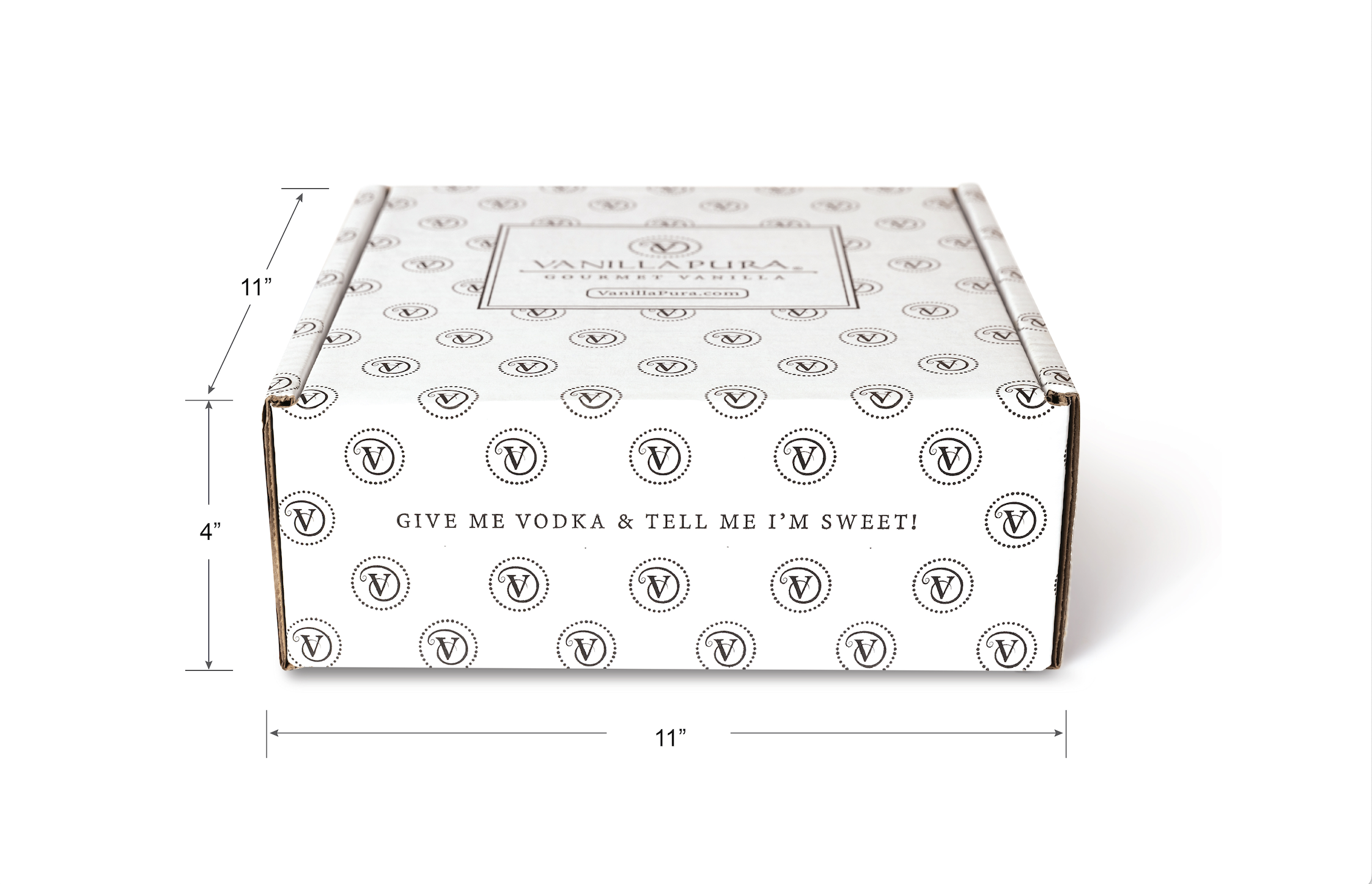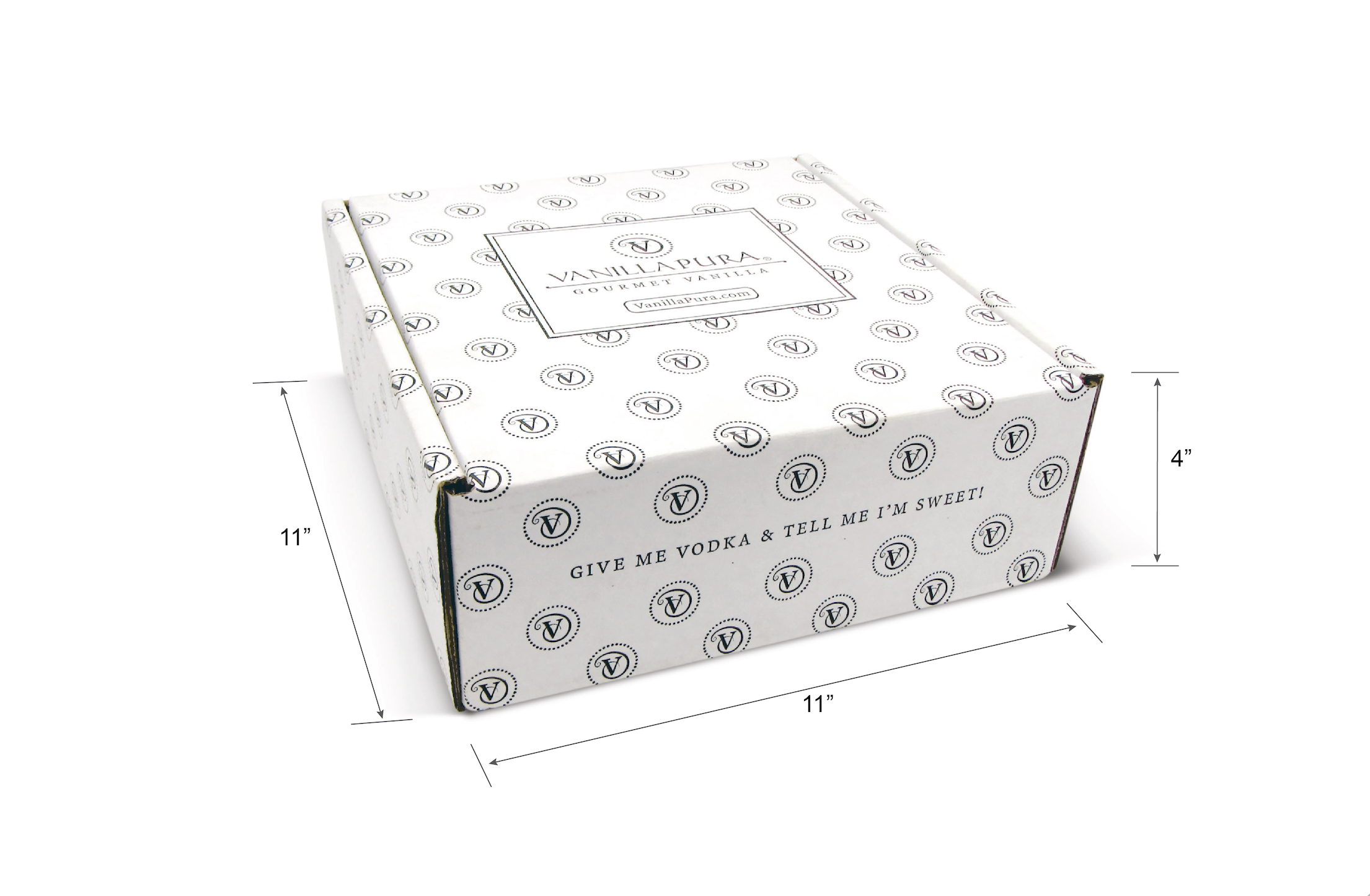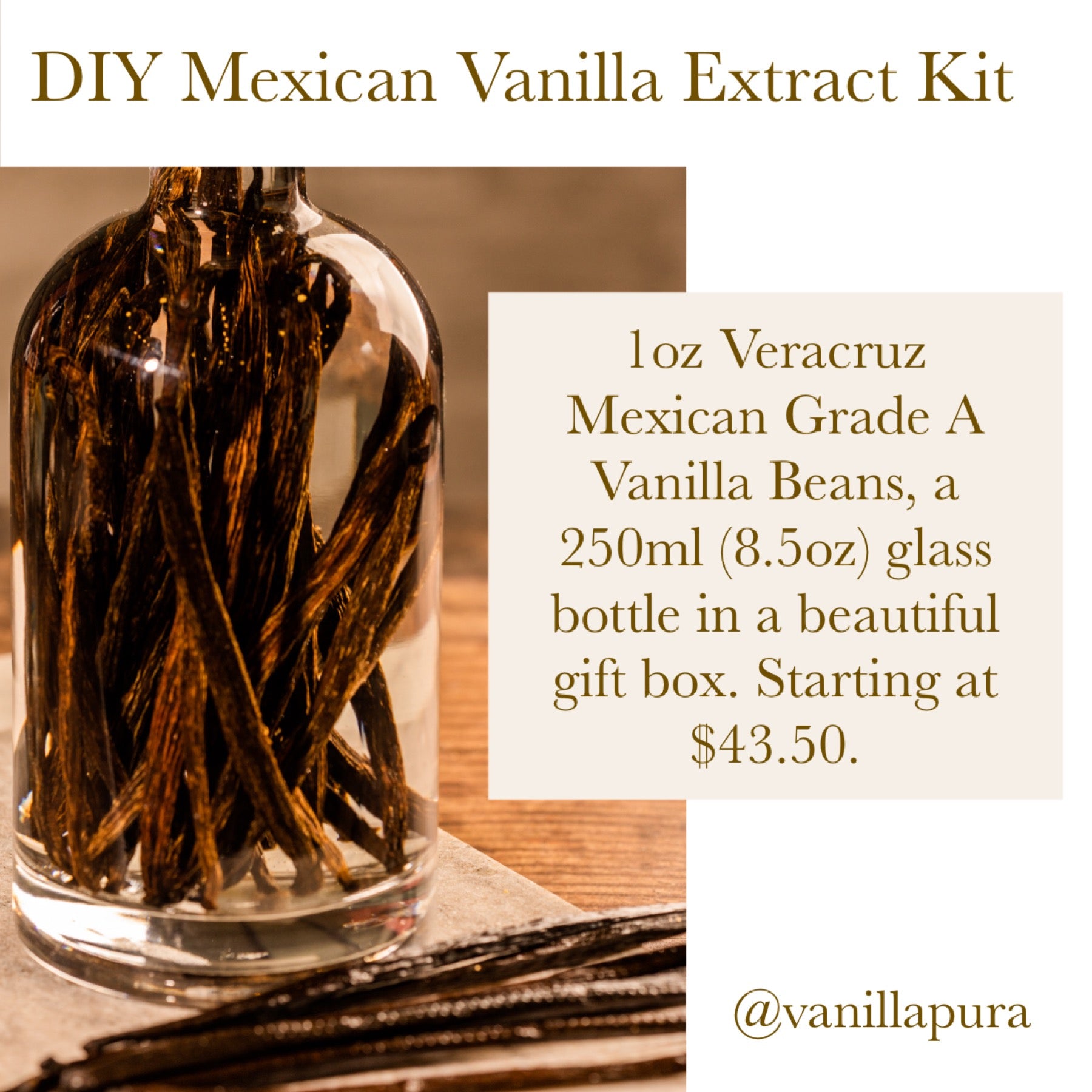 This kit includes 1oz of Veracruz Mexican vanilla beans and one 8oz glass bottle in a decorative box with a recipe on the inside..