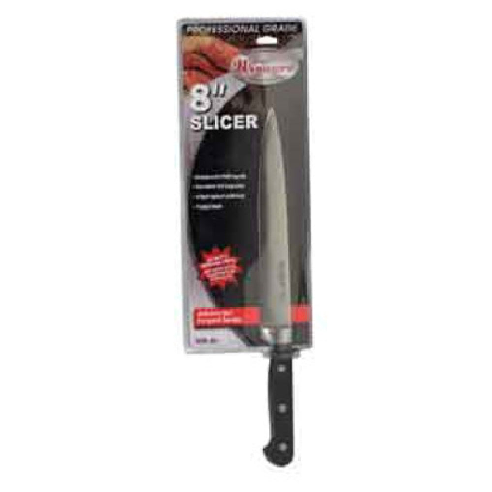 Winco, KFP-81, Acero Slicer, 8" blade, triple riveted, one piece, full tang, forged, German high carbon stainless steel, injection molded POM handle, black, NSF