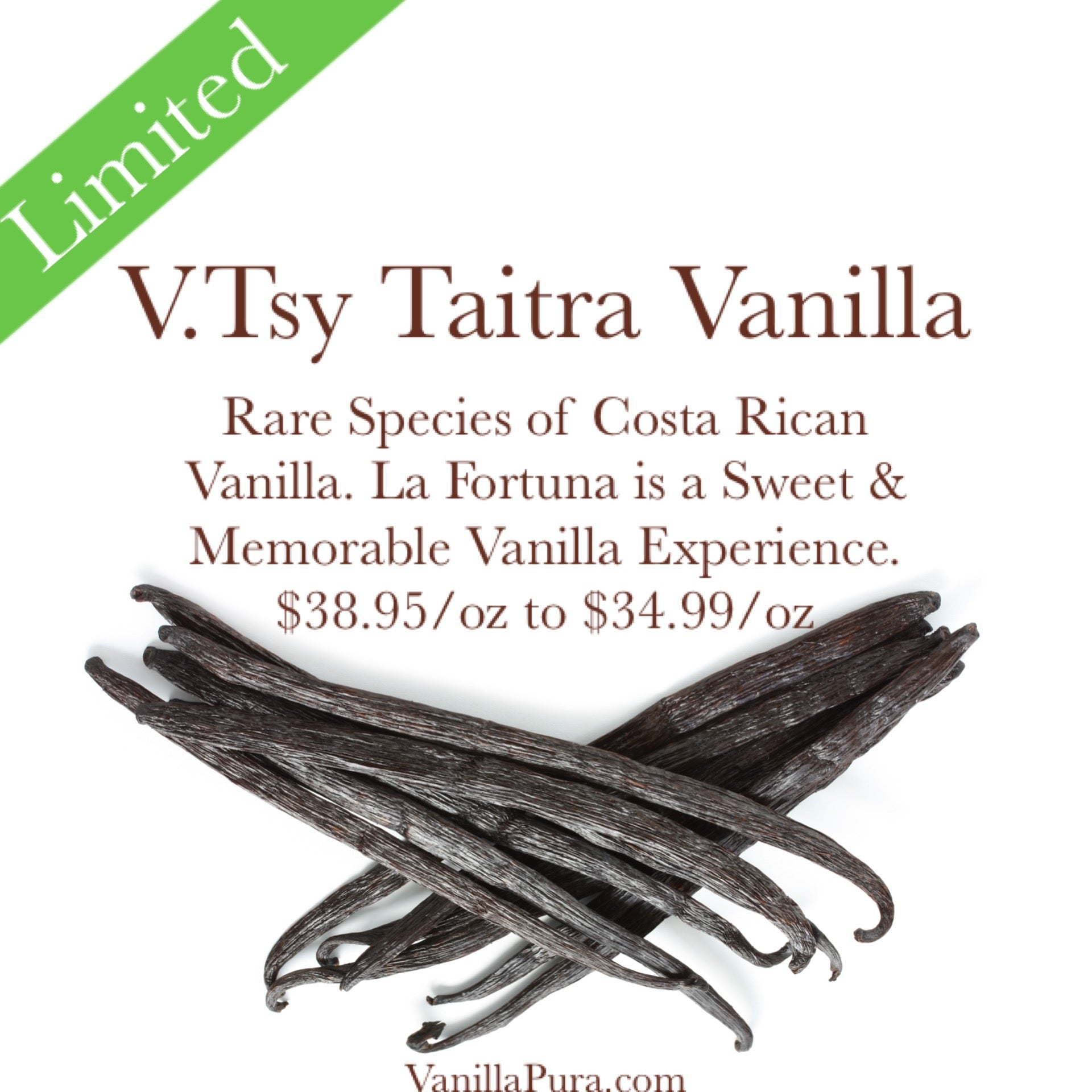 VanillaPura's V. tsy taitra Costa Rican Vanilla Beans are of the highest quality and boast a flavor that is unique to the central American region coupled with a rich vanilla taste found only by this incredibly rare species of vanilla. These aren't the smokey and spicy vanilla beans from Mexico up north, nor are they the extra sweet and fruity vanilla beans from Ecuador down south. These big and beautiful V. tsy taitra vanilla beans have a taste all their own, with notes of toffee, cacao, sweet raisins and plums. It's a beautiful vanilla experience.Β