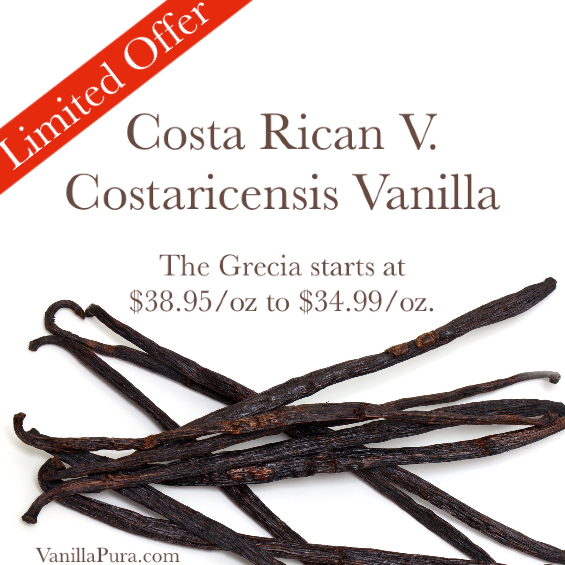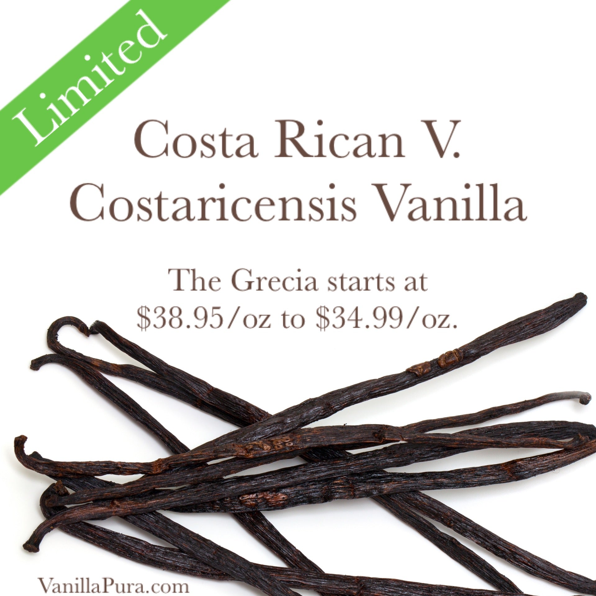Expand your extracts with an entirely new species of vanilla available just a few times a year if we're lucky. Meet The Grecia - a V. Costaricensis big and bold vanilla bean. Up to 9 inches long and just 3-7 beans/oz.Β