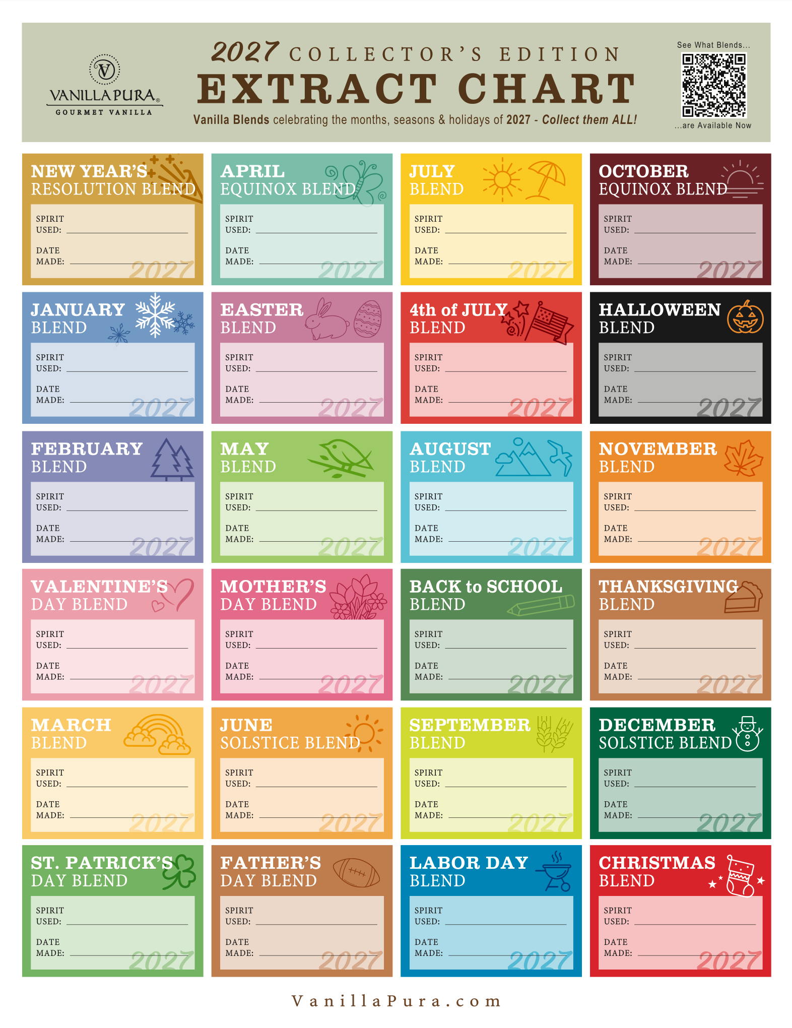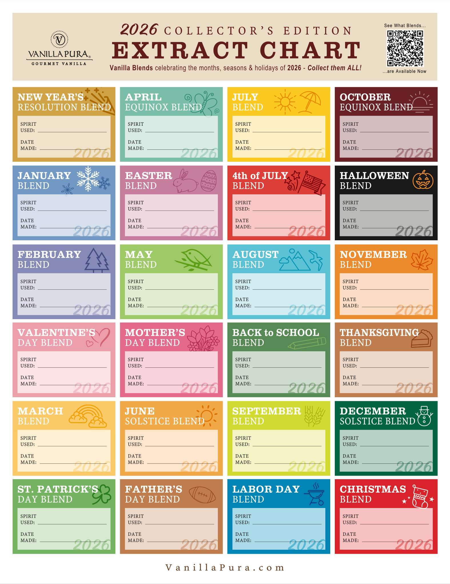 Our 2-sided chart includes all 24 of our collector's edition vanilla blends that only become available once a year. Use the chart to build your collection of them all, by keeping track of the date they are made and the spirit that you used.