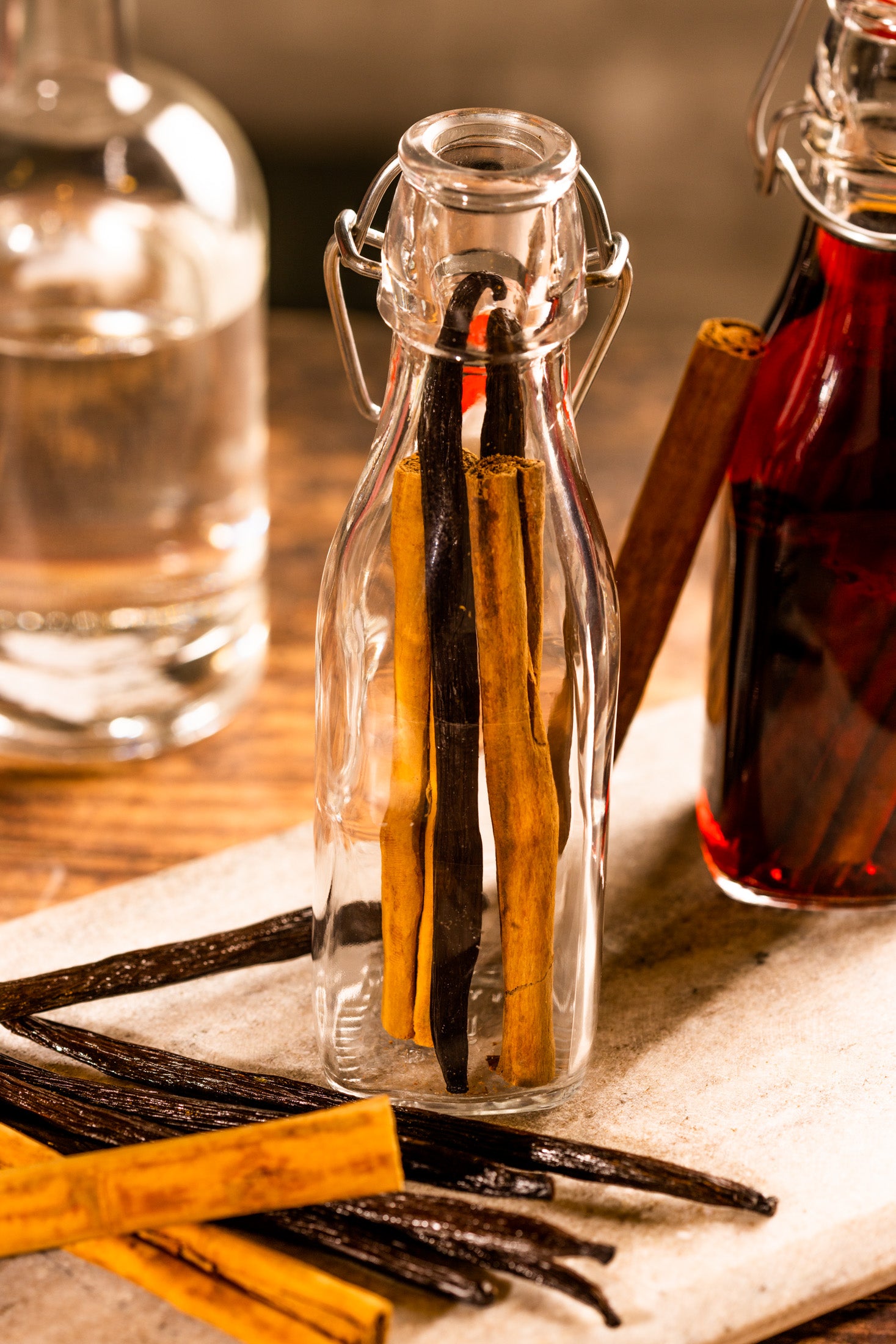 Hacer extracto de vainilla es simple: simplemente agregue frijoles, licores y una tapa... luego espere un año. Es posible que tengas que cortar los frijoles en trozos más pequeños para que quepan en la botella. También recomendamos cortar la vaina del frijol por la mitad para que las semillas dentro del frijol queden completamente expuestas. (Esto equivale a una extracción más rápida). Una vez llena cada botella, guarde el extracto de vainilla en un lugar fresco (65 grados aproximadamente) y lejos de la luz solar. Observe cómo el extracto se vuelve lentamente de color ámbar oscuro con el tiempo.
