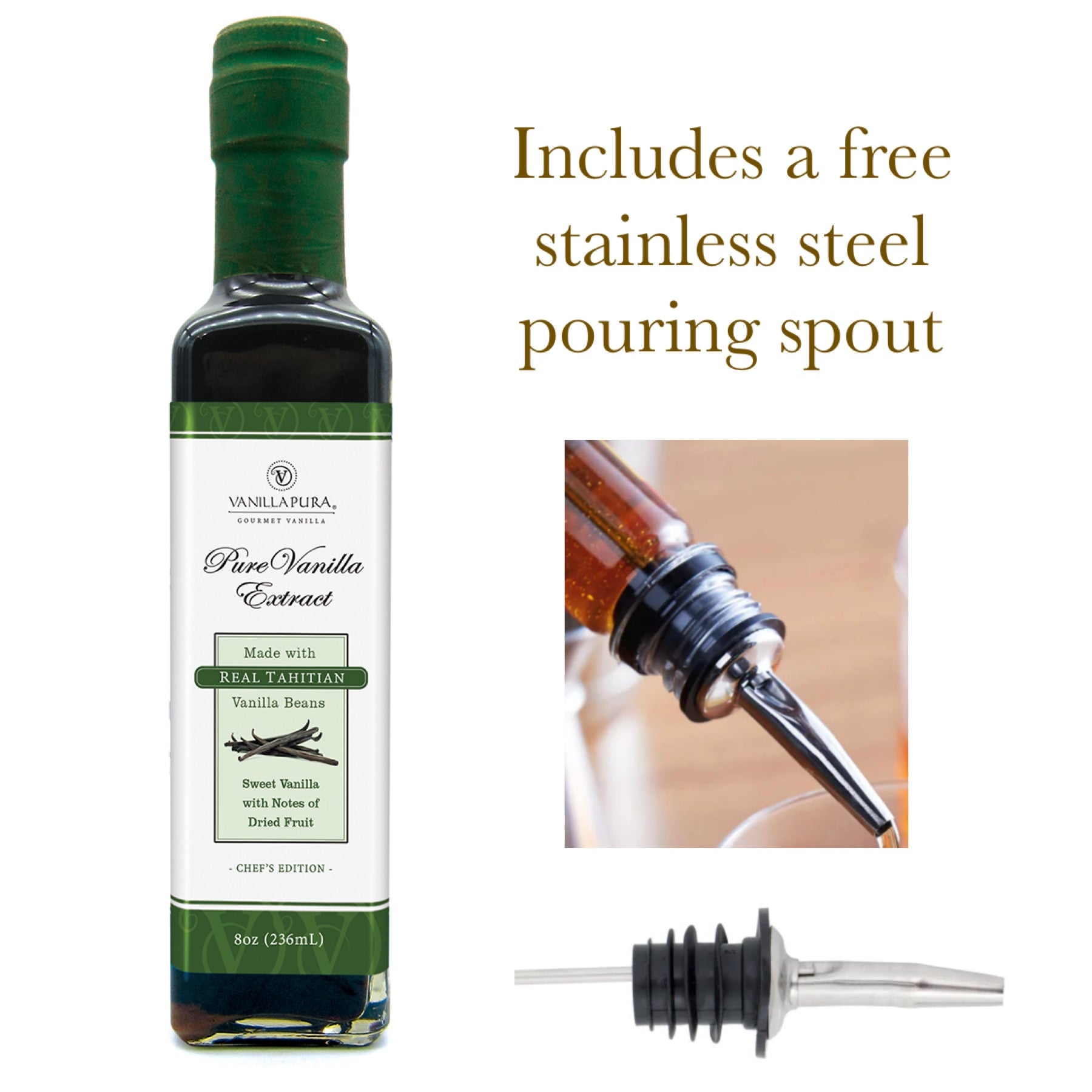 Cada botella de 8 oz de extractos de VanillaPura viene con esta boquilla vertedora de acero inoxidable que no ensucia y sin cargo adicional.