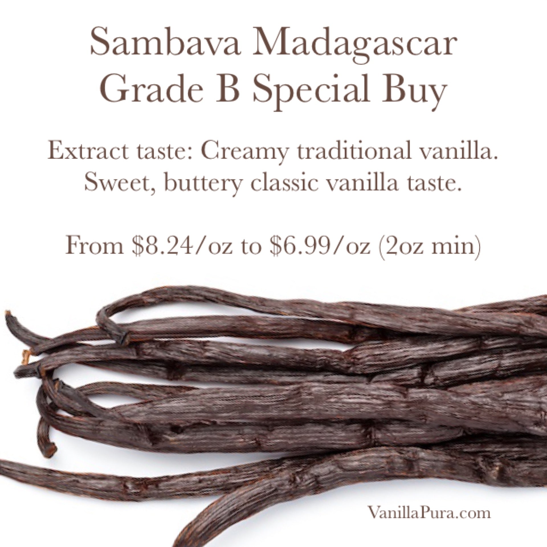 A veces podemos ofrecer precios bajos por única vez en productos en cantidades limitadas. Cuando lo hacemos, los ofrecemos como "compras especiales". Las ofertas especiales de compra tienen nombre propio para ayudarnos a distinguir y separar el inventario. Si bien no hay dos vainas de vainilla iguales, esta vaina de Madagascar "Sambava" se cultivó en la misma región que nuestra vaina de Madagascar normal, pero hoy se ofrece a un precio más bajo y con disponibilidad limitada. Si está en stock, cómpralo rápidamente porque se agotará.