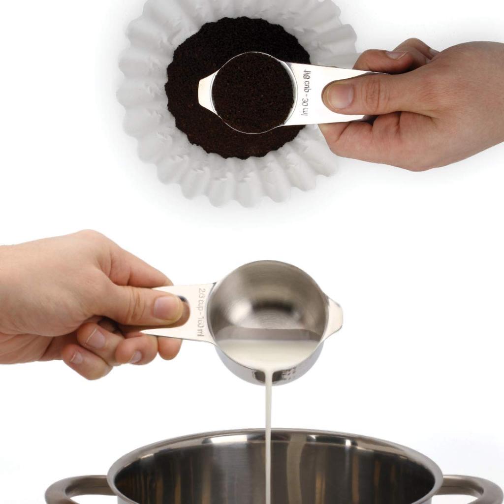 Este juego incluye 7 tazas (1/8, 1/4, 1/3, 1/2, 2/3, 3/4, 1 taza). La taza más pequeña de 1/8 se puede utilizar como cuchara para café. Cada taza incluye medidas de mililitros (ML), así como varios grabados más pequeños para que la medición sea rápida y sencilla.