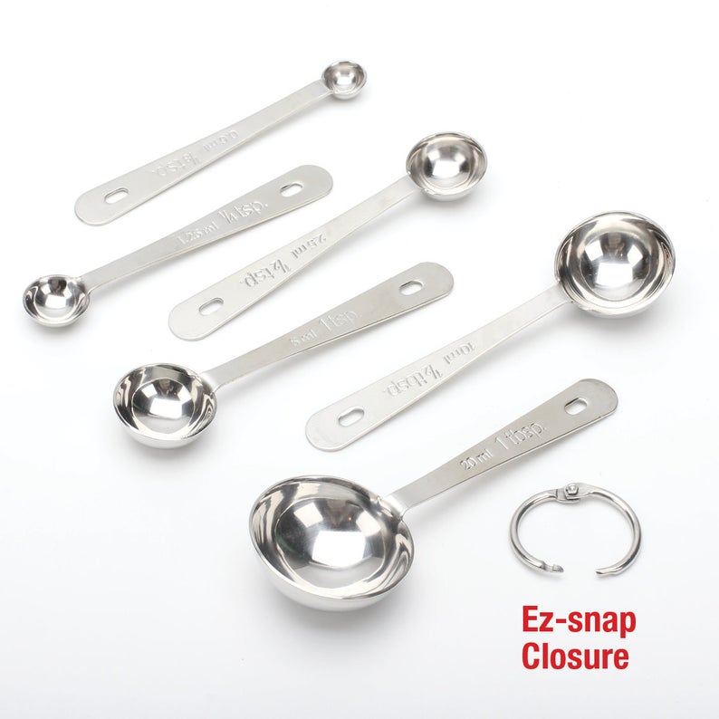 Hornear deliciosos pasteles, pasteles y galletas requiere varias medidas y estas cucharas medidoras tienen la variedad que usted exige con 6 (seis) de los tamaños de cuchara más comunes en medidas estándar de EE. UU. y métricos, cuya precisión se ha probado en laboratorio: 1 cucharada (20 ml), 1/2 cucharada (10 ml), 1 cucharadita (5 ml), 1/2 cucharadita (2,5 ml), 1/4 cucharadita (1,25 ml) y 1/8 cucharadita (0,6 ml).