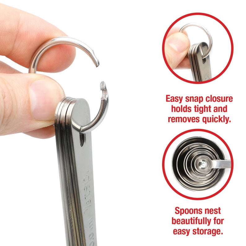 Medir ingredientes líquidos y secos (como sal, pimienta, especias, comino, romero, etc.) no solo es muy sencillo, sino que también es rápido y fácil de limpiar y apto para lavavajillas. Además, el anillo EZ-Snap le permite separar rápidamente las cucharas para compartirlas y medir con precisión es muy fácil. Fácil almacenamiento, se pueden colgar del anillo y se encajan muy bien entre sí.