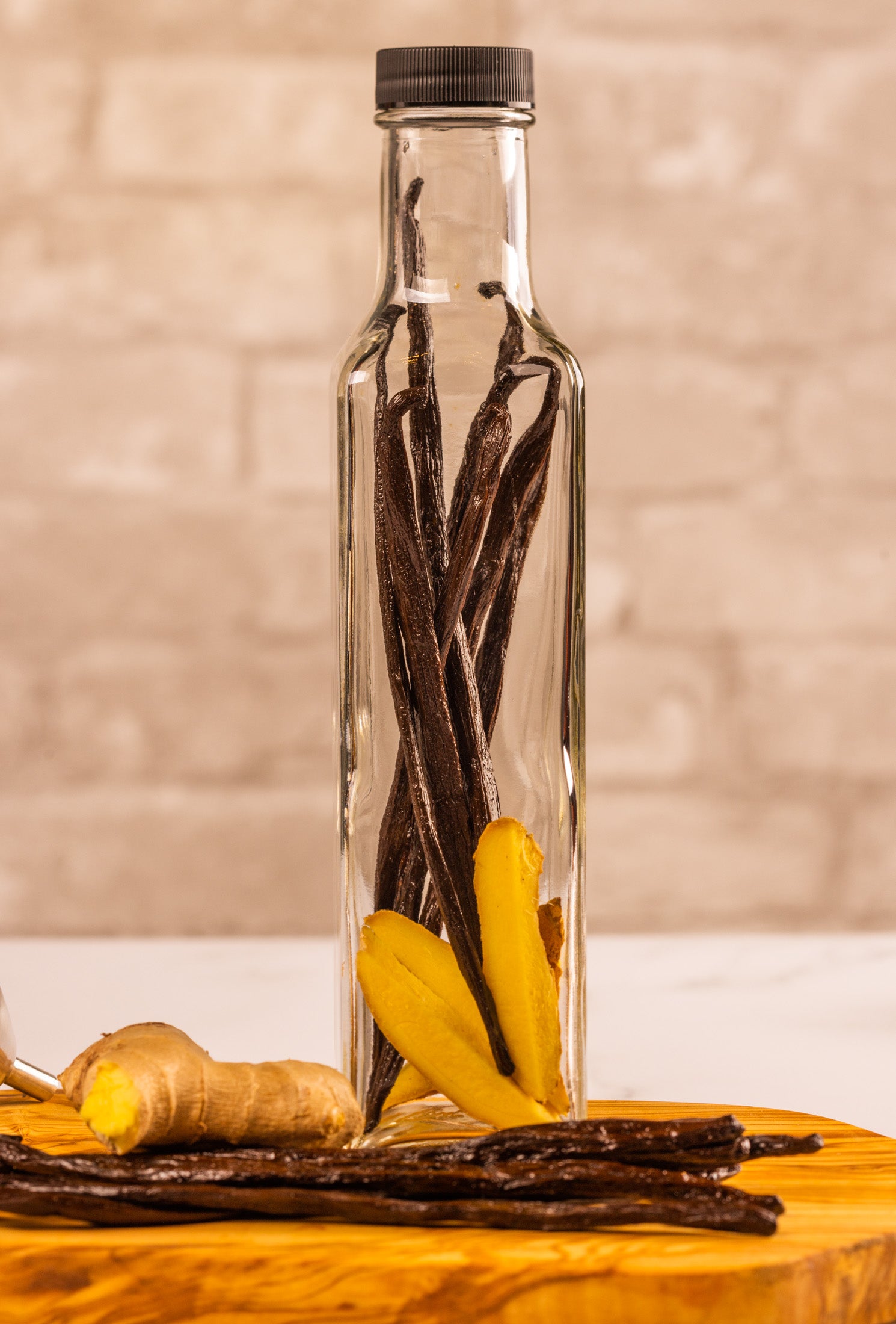 La règle générale typique pour la fabrication d’extraits est de 1 once de haricots pour 8 onces de spiritueux. Ces bouteilles nécessiteront donc 1 once pleine de gousses de vanille de qualité A ou B. avec l'esprit que vous choisissez. Comme ils sont un peu plus gros que 8 onces, ils offrent beaucoup d'espace pour l'alcool, après le déplacement causé par les gousses de vanille à pli simple ou double . Alors soyez créatif et amusez-vous !!