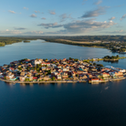 (La petite ville de Flores, au Guatemala, située sur une île avec une seule route.)