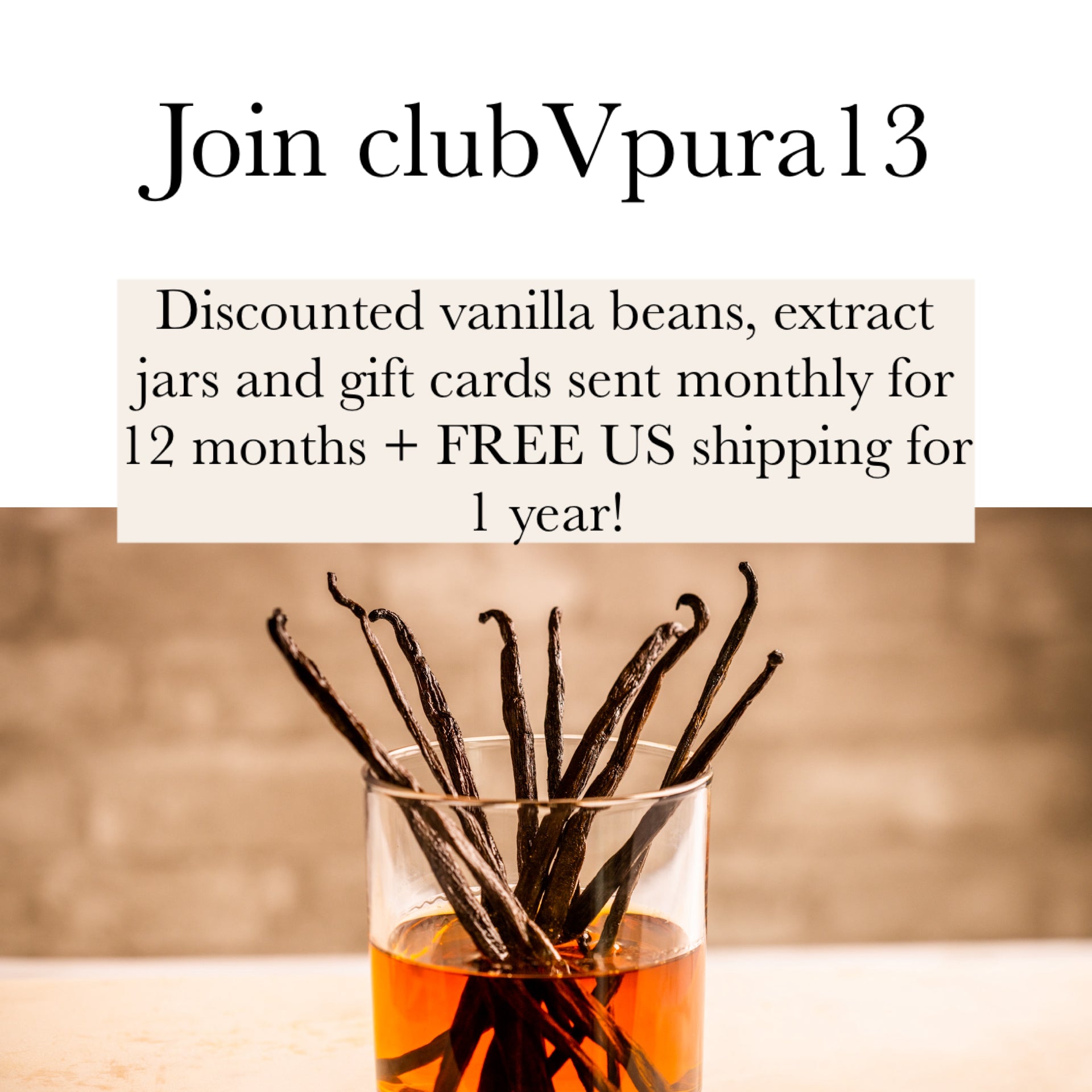 Membership includes includes monthly shipments of 1oz of vanilla beans, discounted gift cards to use on any vanilla bean you choose, 2 Avera Extract Jars and more than 1 year of free shipping (starting immediately) on every order. Details about each month's shipment are in the product images.