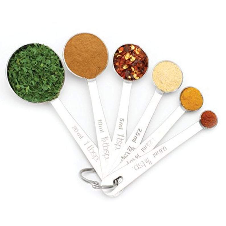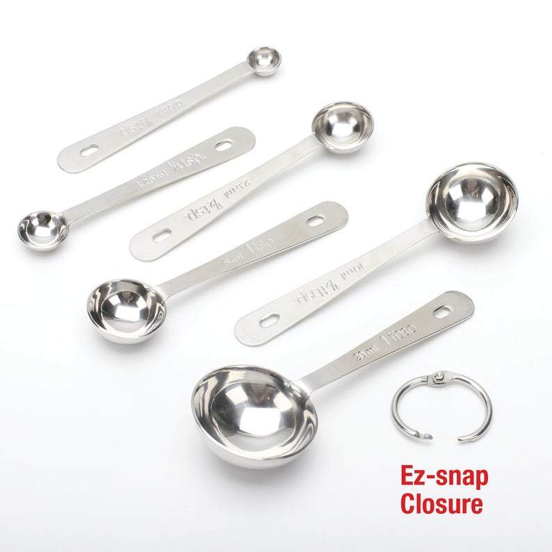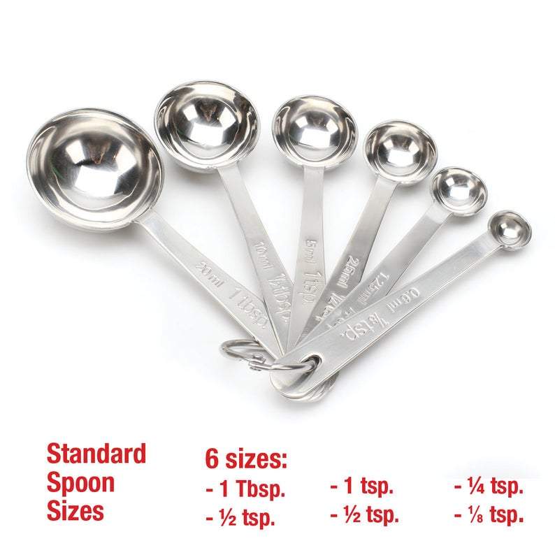 Baking great mouth-watering pies, cakes and cookies requires various measurements and these measuring spoons have the variety you demand with 6 (six) of the most common spoon sizes in standard US and metric measurements, lab-tested for accuracy: 1 tablespoon (20 ml), 1/2 Tablespoon (10 ml), 1 teaspoon (5 ml), 1/2 tsp (2.5 ml), 1/4 tsp (1.25 ml) and 1/8 tsp (0.6 ml).