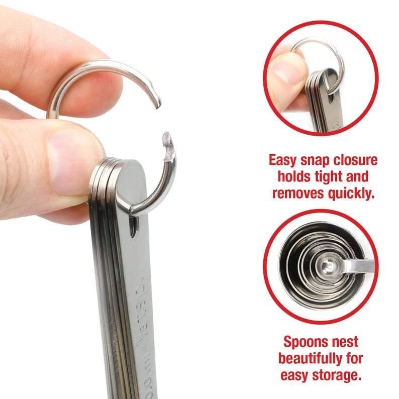 Not only is measuring liquid and dry ingredients (such as salt, pepper, spices, cumin, rosemary, etc.) a breeze, they are quick and easy to clean and dishwasher safe. Also, the EZ-Snap ring lets you quickly separate the spoons for sharing and measuring with accuracy is a breeze. Easy storage, can hang on the ring and they nicely nest together.